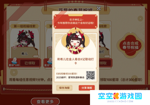 除了精彩的二创内容外,与往届新春会相比,本次星穹铁道新春会的展现形式也大有不同。像是星琼福利并不是直接在评论区简介中放出兑换码,而是变成了经过精心设计的互动游戏——作为新春会总导演的花火,为每位玩家都准备了一份春节礼物。玩家只要观看每组任意一个视频1分钟,便能解锁一个祝福线索,并领取100星琼,最终拼成花火为每位玩家送出的新春寄语。