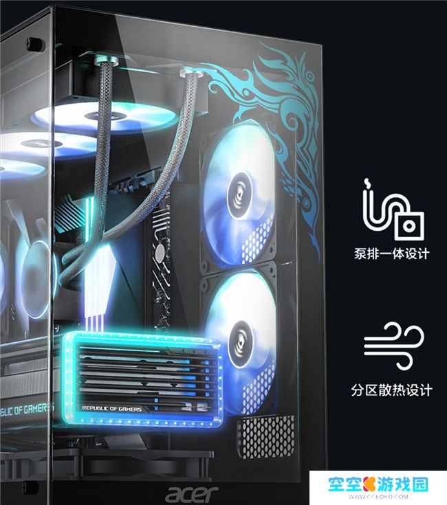 水冷式散热系统在电脑硬件和其他需要高效散热的电子设备中越来越受欢迎,它相较于传统的散热系统具有无可比拟的优势,如更高的散热效率、更低的运行温度、更小的噪音、更理想的散热均匀性,同时机箱美观,且易于维护。宏碁暗影骑士·焕采用了360一体式水冷散热,支持ARGB神光同步,在狂热输出的模式下依然可以保持“清凉”稳定运转,可谓外观虽然冷酷,但内心永远狂热且永动,为长时间游戏作战提供了稳定的保障。