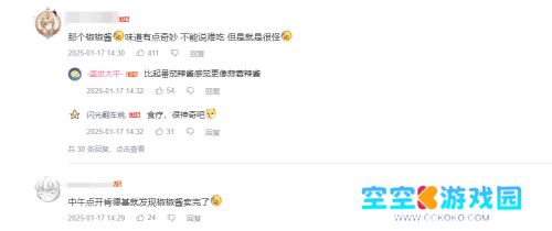 除了在社区中广泛流传的各种联动同人图,与将官图中的飞霄和椒丘“换头”的梗图外,在社区还能看到玩家晒出的各种现场图与对套餐的评价,其中最受玩家们好评的联动餐品便是本身有梗,口味也十分不错的“椒椒酱”和“肯乐达”果汁了。