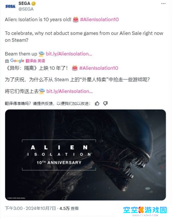 世嘉喜迎《异形:隔离》发售十周年,合集优惠仅需40元